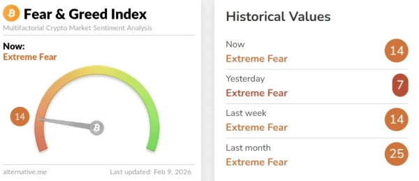 Криптовалютний індекс настроїв перебуває в області «надзвичайного страху» (14 пунктів). 7 лютого індикатор опускався до 6.