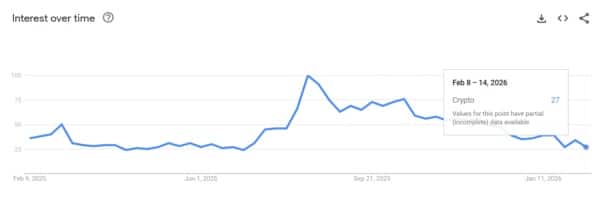 Згідно з даними Google Trends, показник запиту «crypto» знизився до 27 балів зі 100. Пік активності припав на серпень 2025 року, коли обсяг ринку досягав історичного максимуму в $4,2 трлн (на момент написання — близько $2,4 трлн).