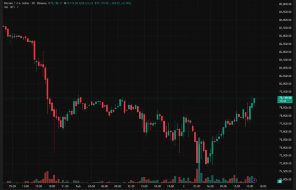 Le 2 février, le prix de la principale cryptomonnaie est tombé sous la barre des 75 000 $. Au moment de la rédaction de cet article, le prix a rebondi pour atteindre environ 79 000 $, l'actif se négociant environ 38 % en dessous de son plus haut historique d'octobre, qui s'élevait à 126 080 $.