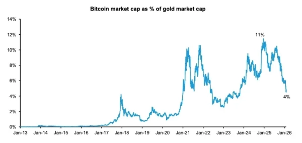 Bernstein a attribué la baisse des prix à un décalage par rapport à la performance de l'or. La capitalisation boursière de l'actif numérique par rapport au métal précieux a chuté à 4 %, approchant son plus bas niveau en deux ans.