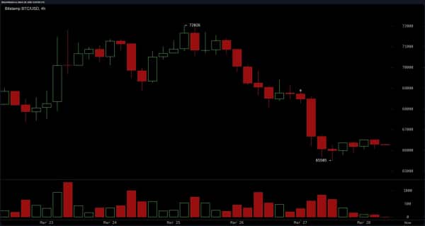 28 березня 2026 року о 8:30 ранку за східним часом курс біткоїну коливався трохи вище за позначку 66 000 доларів за монету, торгуючись у вузькому денному діапазоні на тлі ослаблення динаміки на кількох часових інтервалах. Загальна технічна картина показувала, що ціна утримується поблизу короткострокової підтримки, залишаючись при цьому значно нижчою за основні ковзні середні, що посилювало обережний настрій ринку.
