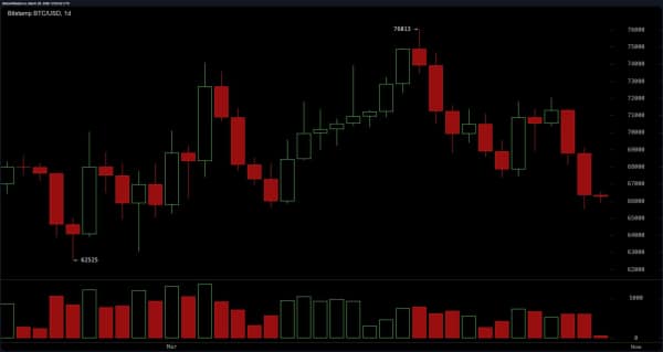 Ціновий рух на денному графіку біткоїну відображало продовження ширшого низхідного тренду, що послідував за нижчим максимумом в районі 76 000 доларів. Поточна зона близько 66 000-67 000 доларів стала тимчасовою підтримкою, але нездатність повернути вищі рівні підкреслює слабкість, що зберігається.