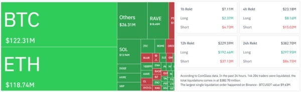 За даними Coinglass, за останні 24 години ліквідації лонгів за біткоїном склали $102,3 млн, шортів – $20 млн.