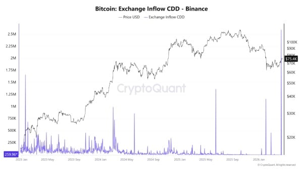 У CryptoQuant вказали на стрибок метрики CDD досяг найвищого рівня з початку 2023 року. Індикатор відображає переведення «сплячих» монет довгостроковими власниками на біржі для фіксації прибутку. Згідно з фахівцями, така поведінка створює серйозний бар'єр опору близько $75 000.