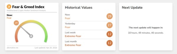 Індекс страху та жадібності підвищився з 27 до 29 пунктів, зберігши позиції в зоні страху.