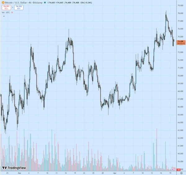 19 квітня біткоїн ( $BTC ) продовжив коригувати хвилю зростання до максимумів з лютого. Після того спроби повернути котирування вище пройденого вниз місячного піку ($76 000) провалилися, негативна динаміка відновилася до наступної локальної підтримки поблизу $73 600.
