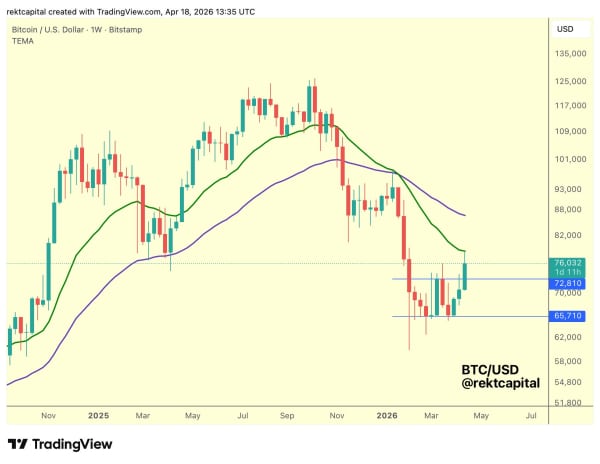 Аналітик Rekt Capital спрогнозував повернення котирувань до верхньої межі розворотної моделі «подвійне дно» ($73 000) після відбою від 21-тижневої експоненційної ковзної середньої (виділено зеленим кольором).