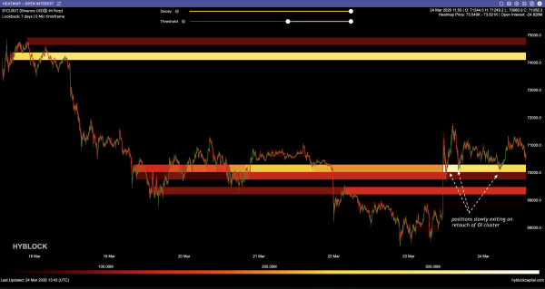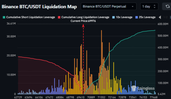 Аналітик Daan Crypto Trades вказав на утворення ліквідаційних кластерів у безстрокових контрактах на біткоїн на позначках $69 000 і $71 500. Вихід за одну з них створить передумови для закриття позицій і надасть динамізму руху в бік пробою.