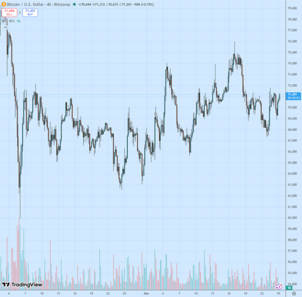 24 березня курс біткоїну ( $BTC ) протестував у ролі підтримки пройдений вгору локальний опір у зоні $69 000-69 300, надалі були купівлі до недавніх максимумів, які були досягнуті в середу вранці.
