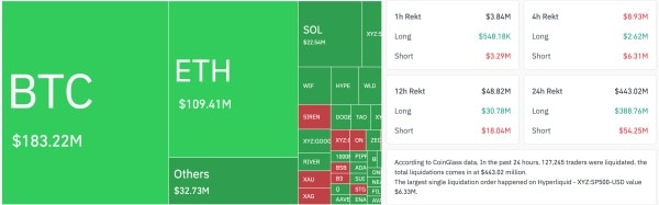 За останню добу сукупний обсяг ліквідацій на крипторинці становив $443,06 млн. Примусово закрито позиції 127 317 трейдерів.