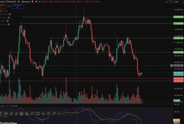 Після вчорашніх спроб утриматися вище за $68 000, біткоїн ( $BTC ) оновив локальні мінімуми, опустившись до позначок трохи вище за $65 500. Потім ціна стабілізувалася в районі $66 400.