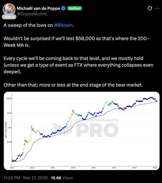 У разі зламу локальних трендів фокус аналітиків зміщується на старші таймфрейми. Критично важливим макрорівнем захисту для бугаїв виступає 200-тижнева ковзна середня, яка проходить через позначку $58 000.