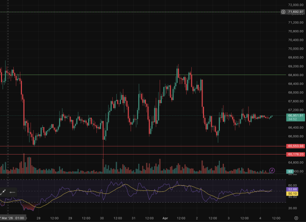 Біткоїн торгується біля позначки $66 950, застрягши у вузькому діапазоні без явного імпульсу до зростання.