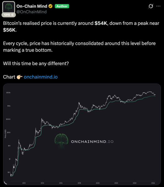 Згідно з ончейн-даним, потужним гравітаційним «магнітом» для поточної ціни виступає рівень реалізованої ціни на позначці $54 000. Саме там може відбутися фінальна капітуляція та «очищення» ринку.