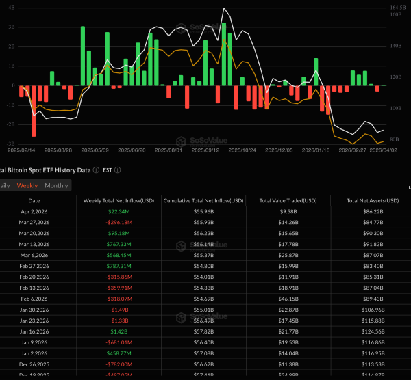 За тиждень чиста притока в біткоін-ETF склала всього $22,34 млн.