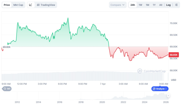 Біткоїн (BTC) відступив до позначки $68 589 під час азіатської сесії 7 квітня, розгубивши частину прибутку, отриманого під час ралі на день раніше.