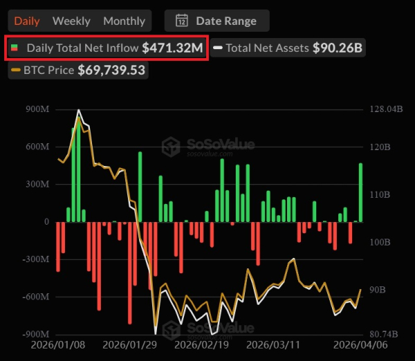 За даними SoSoValue, 6 квітня спотові біткоін-ETF зафіксували чисту притоку в $471 млн. Це найкращий результат більш ніж за місяць і шостий за величиною показник у 2026 році.