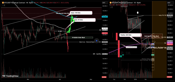 На 4-годинному таймфреймі (H4) структура була зламана вгору, але імпульс потребує захисту вище рівня $67 000, щоб не перетворитися на хибний вихід.