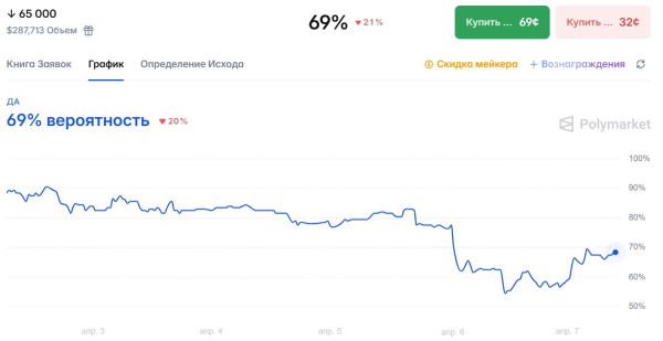 Імовірність падіння біткоїну нижче за $65 000. Джерело: Polymarket.