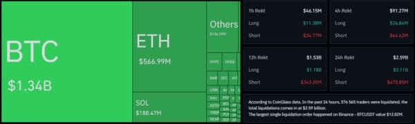 Стрімке зниження цін спровокувало лавину ліквідацій. Згідно з даними CoinGlass, денний обсяг примусових закриттів досяг $2,59 млрд. Основний тягар ліг на довгі позиції — $2,11 млрд.
