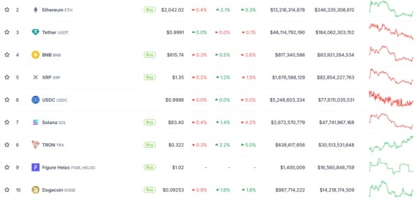 Альткоїни підтримали невелике відновлення: Ethereum піднявся до $2042, Solana — до $83,4, XRP — до $1,35. Однак на тижневому графіку загальна ситуація залишається негативною. Виняток — ETH і TRX, які додали 0,3% і 5% відповідно.