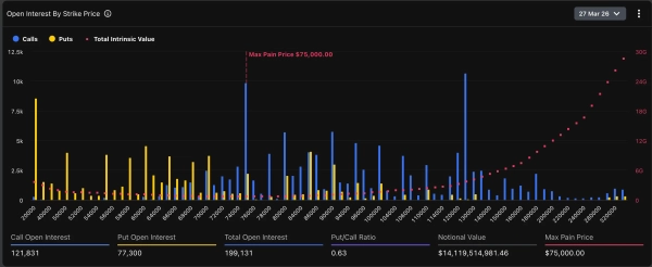 За даними Deribit, ціна “максимального болю” – рівень, при досягненні якого більшість контрактів закінчаться без виплати прибутку (як лотерейні квитки, що не виграли), – знаходиться рівно на позначці $ 75 000.