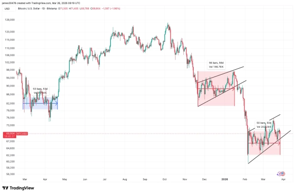 Трейдери, які розглядають майже 50-денну нестабільність цін на біткоїн крізь призму ведмежого сценарію, можуть помилятися. Тривалий рух ціни в обмеженому діапазоні сигналізує швидше про структурну консолідацію, ніж про класичне продовження ведмежого тренду, незважаючи на ризики зниження, що зростають.