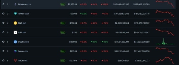 Ethereum втратив 4,4% ринкової вартості, знизившись до $2973, BNB — 4% ($877), XRP — 1,7% ($1,92), Solana — 2,6% ($128).