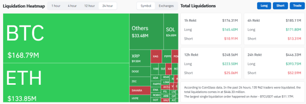 - Обсяг ліквідацій за 24 години перевищив $445 млн.