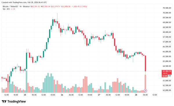 Вранці 28 лютого 2026 року курс біткоїну різко обрушився, пробивши рівень $64 000, згідно TradingView. Можливою причиною корекції є макроекономічне тло, насамперед — ескалація геополітичної ситуації на Близькому Сході.