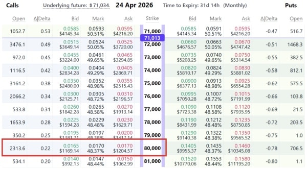 На біржі Deribit кол-опціон на біткоїн із забастовкою $80 000 із експірацією 24 квітня торгувався по 0,017 $BTC ($1 207). При очевидній волатильності 48% і 31 дні до закінчення ринок оцінює ймовірність досягнення цієї позначки становить лише 20%. Для криптовалютного ринку, де учасники історично налаштовані оптимістично, таке низьке очікування зростання на 13% за місяць є нетиповим.