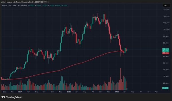 23 березня біткоїн протестував рівень 200-тижневої експоненційної ковзної середньої (EMA) і втримав цю позначку — обмежений, але показовий результат на тлі п'яти місяців низхідної динаміки. Дані деривативного ринку поки не фіксують якісного зсуву в настроях: для стійкого руху вгору ринку може знадобитися вагоміший каталізатор, ніж слова Трампа.