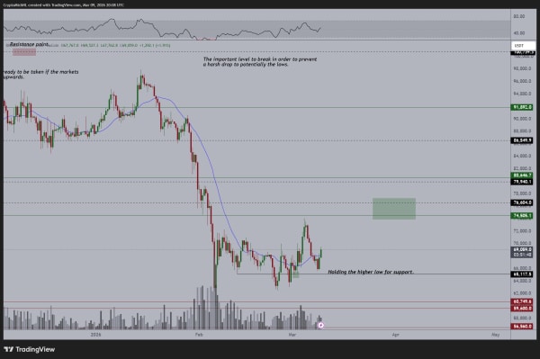 На думку фахівців, є підстави розраховувати на повернення котирувань до попереднього діапазону $70 000-80 000 «на тлі поступового зменшення впливу подій навколо Ірану на поведінку ризикових активів».
