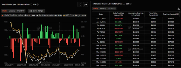 Незважаючи на відновлення курсу, 13 квітня спотові ETF на основі першої криптовалюти зафіксували відтік $291 млн. Ethereum-фонди залучили незначні $9 млн.