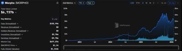 Morpho утримує сьому позицію за обсягом заблокованих коштів серед DeFi-протоколів із показником $6,7 млрд.