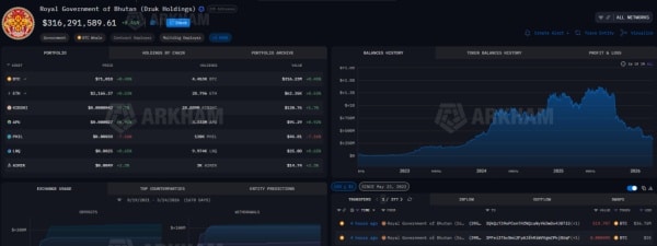 Бутан збільшував свої криптовалютні запаси через майнінг, використовуючи ресурси гідроелектроенергії. У піковий період у жовтні 2024 року резерви держави досягали 13 000 BTC.