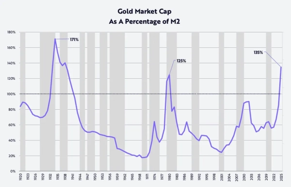 Elle a également souligné que la récente flambée du cours de l'or a atteint des niveaux historiques extrêmes. Son ratio capitalisation/masse monétaire (M2) est revenu aux niveaux observés au début des années 1930 et 1980, ce qui, par le passé, a servi d'indicateur de fortes hausses boursières après des corrections.