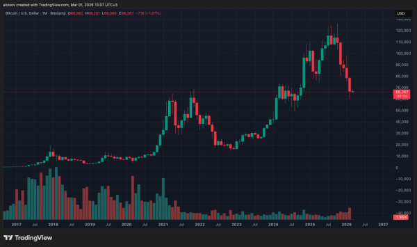 Тиждень відкрився падінням нижче за $65 000: рішення Трампа підвищити глобальний тариф з 10% до 15% спровокувало ліквідації довгих позицій на $230 млн. Біткоїн рухається до закриття п'ятого поспіль «червоного» місяця — другий подібний випадок у нещодавній історії. Аналітик Rekt Capital попереджає: 200-тижнева EMA тепер виступає опором, а історично найкоротший ведмежий ринок тривав 365 днів – поточний налічує лише близько 140.