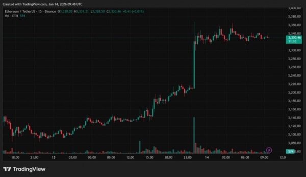 Позитивна ончейн-динаміка відбилася на котируваннях: ціна Ethereum перевірила на міцність рівень $3350. На момент написання статті актив торгується по $3340 (+6,9%).