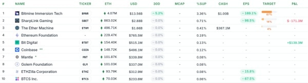 Топ-10 найбільших тримачів Ethereum серед публічних компаній. Джерело: Strategic ETH Reserve.