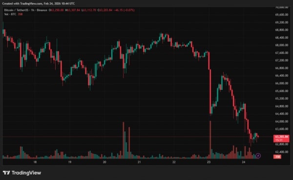 24 лютого вартість біткоїна досягла нового локального мінімуму поблизу $62 800. За 24 години актив втратив в ціні майже 5%. На час написання матеріалу курс повернувся до $63 200.