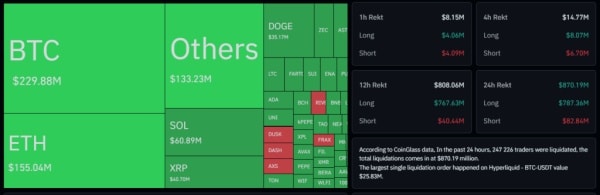 Підвищена мінливість викликала масштабні ліквідації на ф’ючерсному ринку. Лише протягом чотирьох годин трейдери втратили понад $870 млн, причому основна частина збитків припала на довгі позиції.