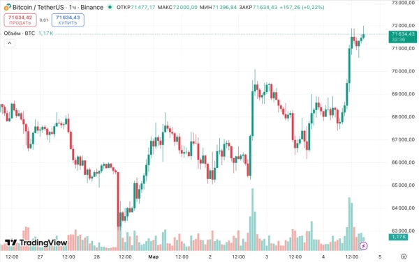 Біткоїн також консолідується близько 200-тижневої середньої ковзної — рівня, який історично збігався з ринковими мінімумами. На момент написання актив торгується близько $71 600. За останню добу його ціна підскочила на 6,7%.