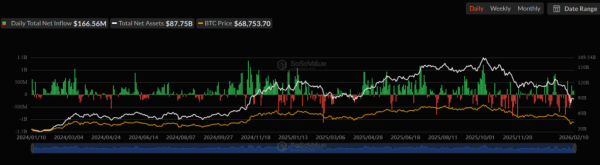 У лютому цього року тенденції змінилися. 10 числа чистий приплив у спотові біткоїн-фонди досяг $166,56 млн, позитивна динаміка тривала три дні поспіль.