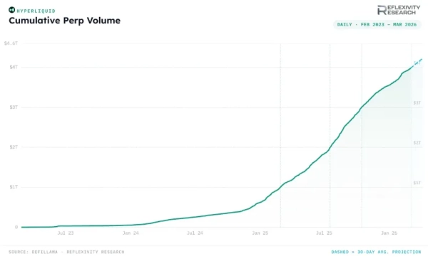 Загальний обсяг торгів безстроковими контрактами на платформі Hyperliquid перевершив позначку в $4 трлн. Щоб досягти цього показника, проєкту знадобилося три роки.
