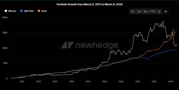 Аналогічна тенденція спостерігається і при збільшенні внесків до $250 на тиждень на п’ятирічному інтервалі: головна криптовалюта знову обганяє S&P 500 за рівнем прибутковості, хоча лідируючу позицію в цьому порівнянні продовжує утримувати золото.