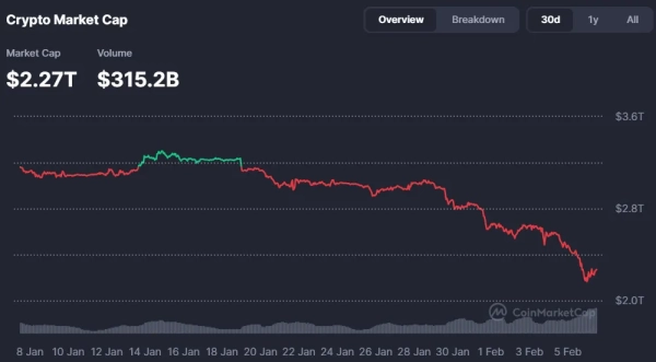 За інформацією CoinMarketCap, загальна ринкова капіталізація впала до $2,27 трлн. Спадний тренд триває з 14 січня 2026 року.