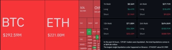 Підвищення курсів спровокувало хвилю ліквідацій на ринку деривативів. За минулу добу трейдери втратили $588,93 млн на примусовому закритті коротких позицій. З цієї суми $292,59 млн припало на біткоїн.