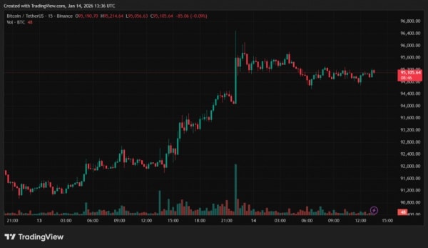 14 січня курс біткоїна піднявся вище $96 000, зафіксувавши найвищий показник з листопада. Після кількох тижнів бічного тренду криптовалюта доєдналася до підйому ризикових активів і благородних металів.