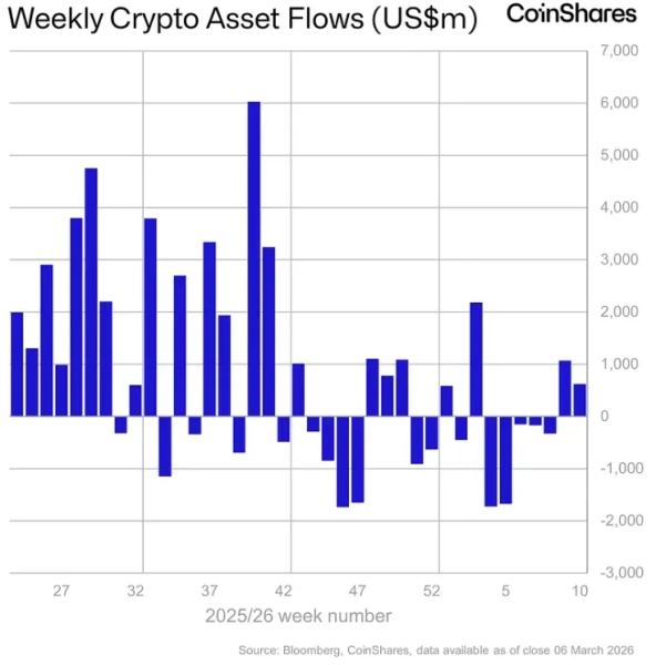 В період з 2 по 6 березня приплив грошових коштів у криптоінвестиційні продукти склав $619 млн. Про це повідомляється у звіті від аналітиків CoinShares.
